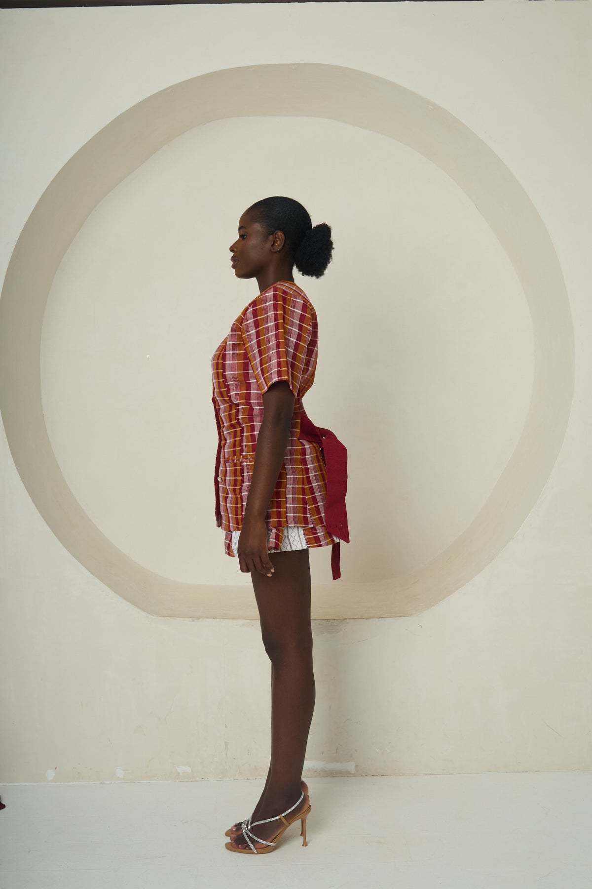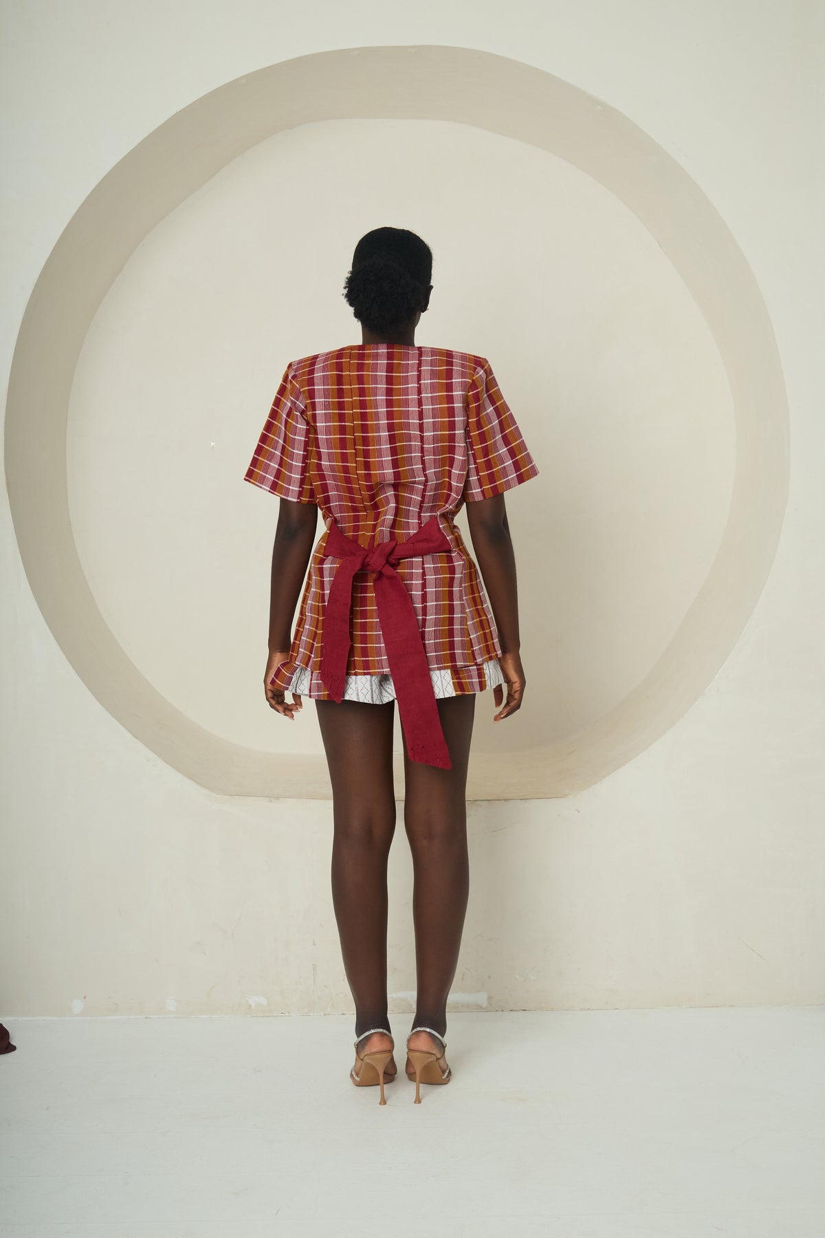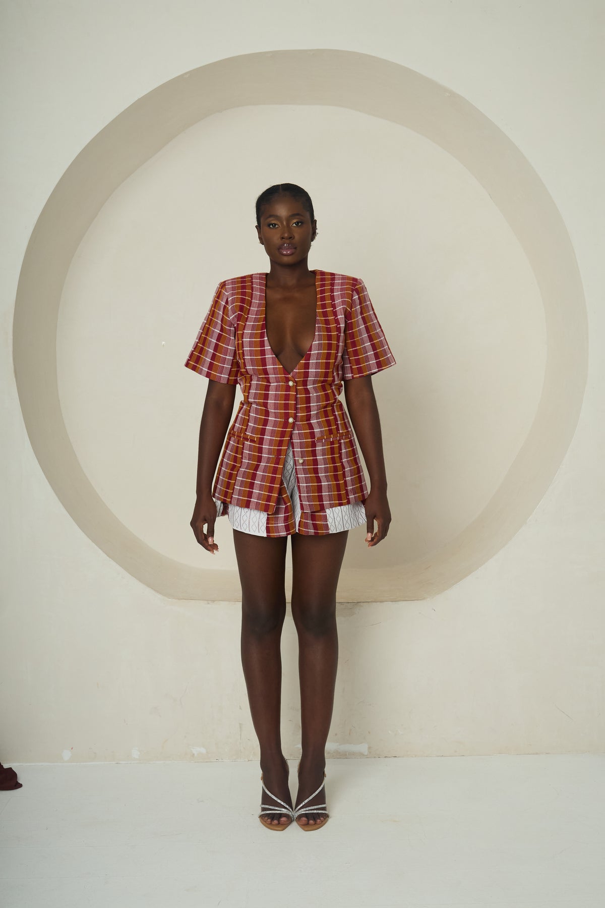 Eyi is a spirited, contemporary interpretation of Idoma heritage. The tailored V-neck jacket with short, structured sleeves cinches at the waist before flaring subtly at the hips, creating a flattering hourglass shape. Paired with matching high-waisted shorts, this set delivers both sophistication and playful charm. The vibrant red-and-white woven check fabric draws directly from traditional Idoma patterns, while the modern cut makes it perfect for stylish cultural events, performances, or confident street-style moments.