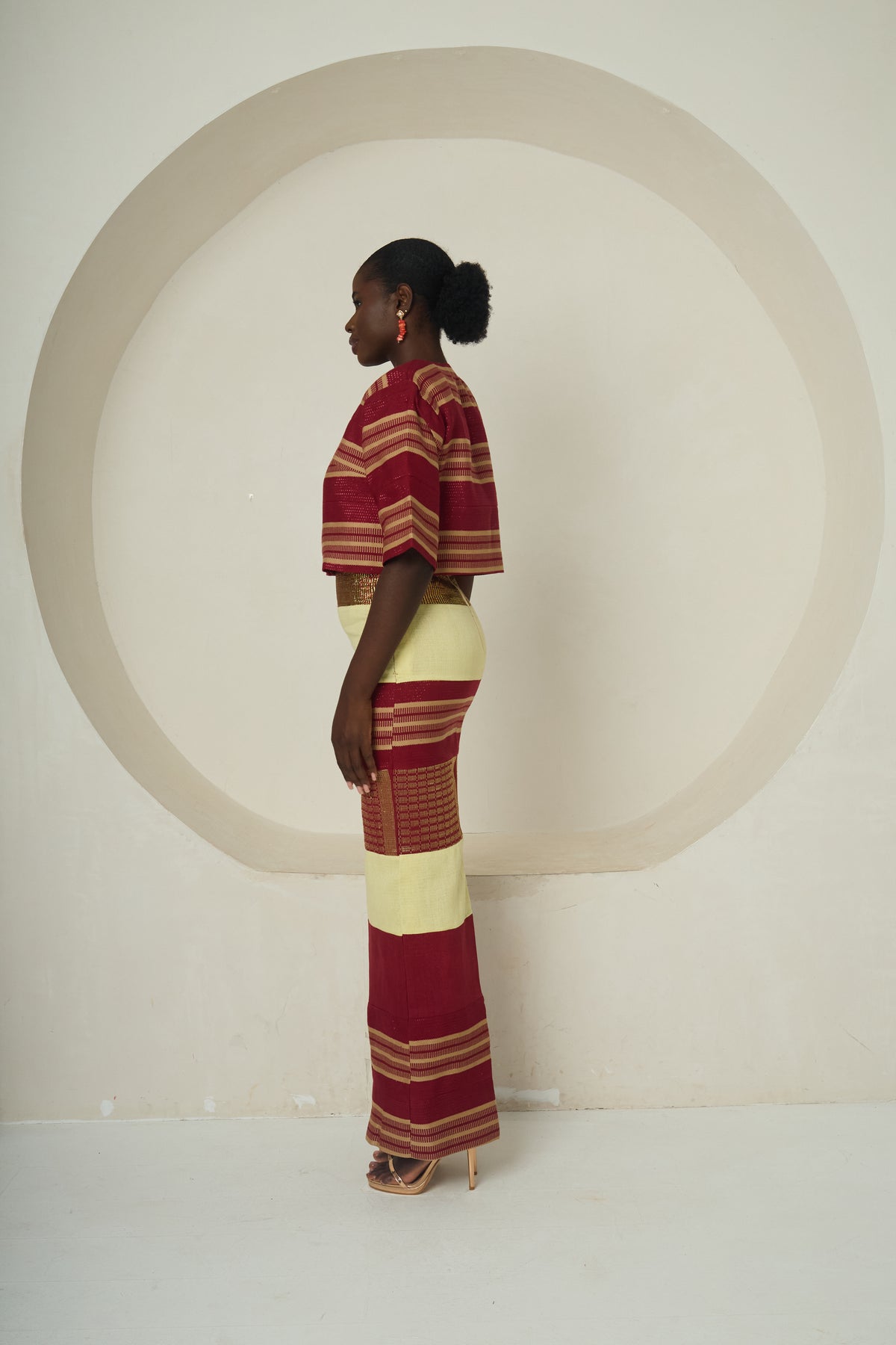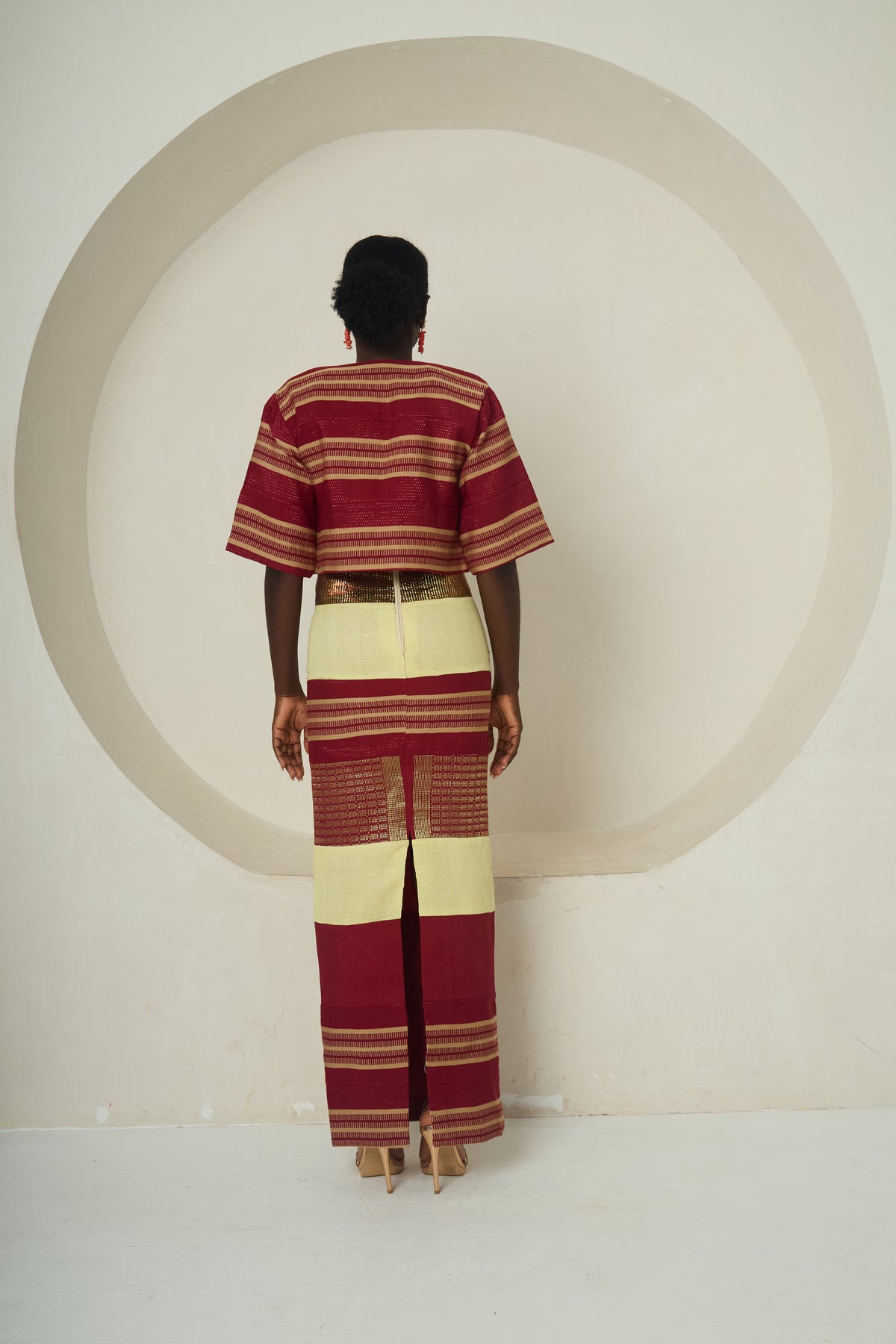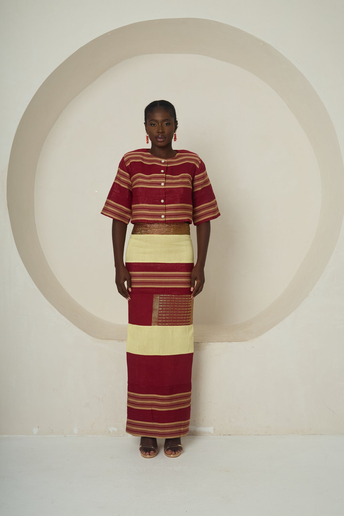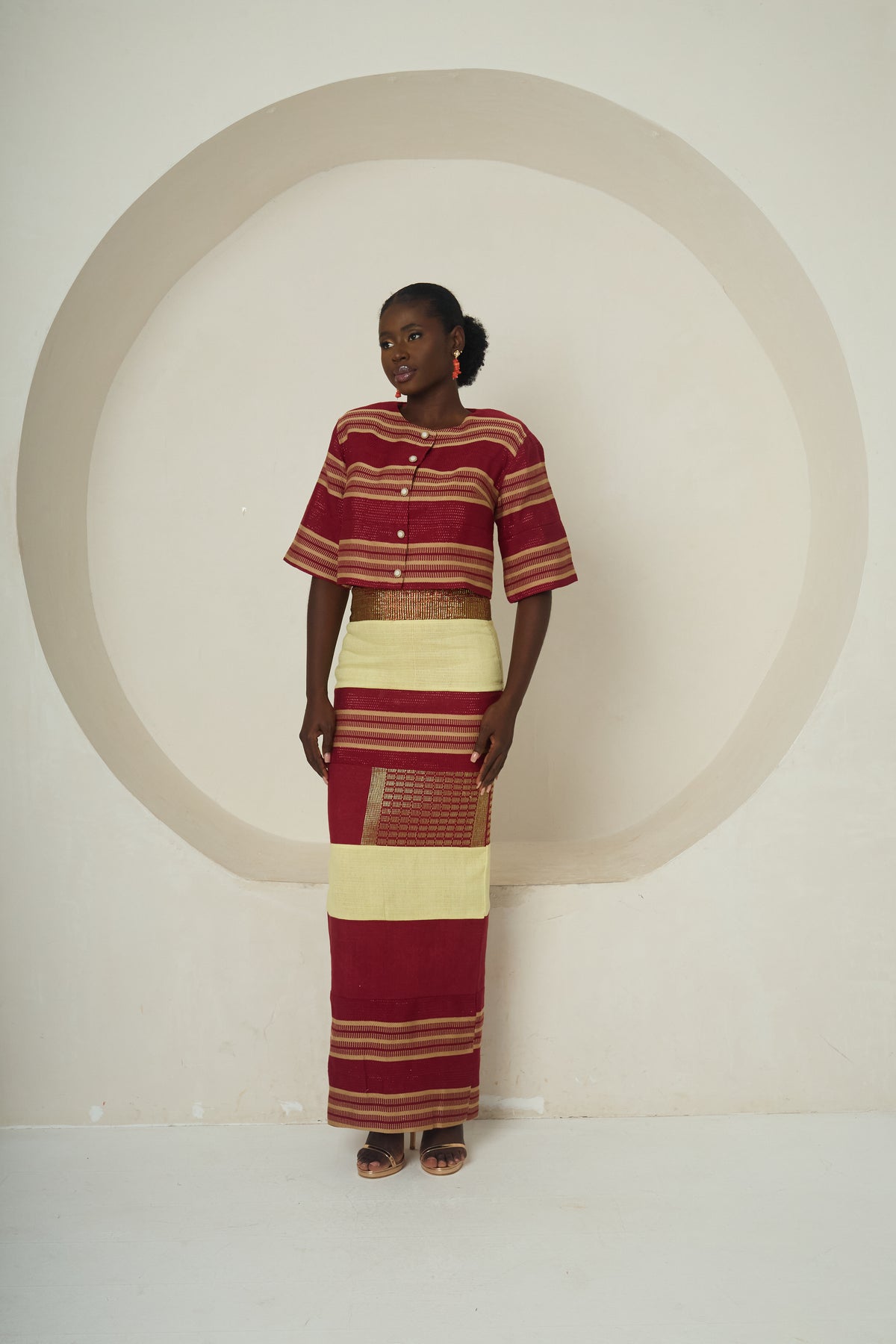 The Ochanya set is a timeless two-piece ensemble crafted from authentic Idoma-inspired woven fabric. The cropped top features a wide, relaxed fit with elbow-length sleeves, front button closure, and clean tailoring, while the full-length skirt is a straight-cut masterpiece of alternating deep red, earthy gold, and intricate weave panels. This piece harmonises cultural heritage with modern sophistication, perfect for ceremonial occasions, cultural events, or statement-making moments.